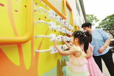 这条社区道路上的老旧变电房同样被纳入了改造项目,社区收集孩子们的奇思妙想,发动孩子们自己动手,将其打造成了新奇有趣的“隔空传声”微景观,每天上下学的路上,小朋友们都来到这里,与小伙伴玩耍体验,他们欣赏着自己的作品,开心地说:“隔空传声好神奇啊,我还想玩一次!”“快来看,这是我的彩绘作品!”