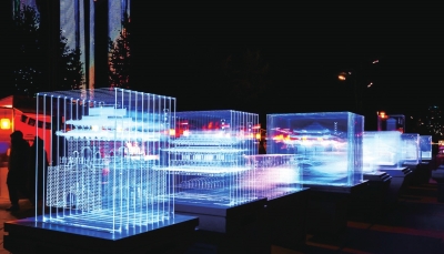 戴福明和他的团队提取了中轴线上的18座标志性历史建筑,通过三维模拟立体模型,将每个切片解构成平面艺术画面,并雕刻在280块导光板上。这些导光板再经过重组堆叠,形成了全新的光影艺术形态。《光韵中轴》还融入了互动创新元素。观众可以通过肢体动作与灯光装置互动,触发建筑剪影的光影流动。这种互动体验不仅让观众更加深入地了解了中轴线的历史与文化,也展现了朝阳区的文化数字化与创新氛围。