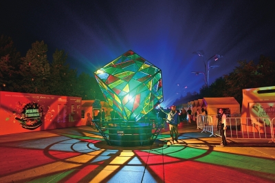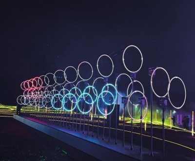 “去年朝阳灯光节,我们也荣幸参与了钢琴艺术装置的创作。”Collectif Scale中国主理人朱琪介绍,“今年,我们以‘动能’为核心,从《星球大战》、电子游戏和现代艺术等汲取灵感,运用LED设计、机器人等科技手段,创作出作品《HULA⁃HOOP呼啦圈》,希望用灯光温暖朝阳群众的冬天。”