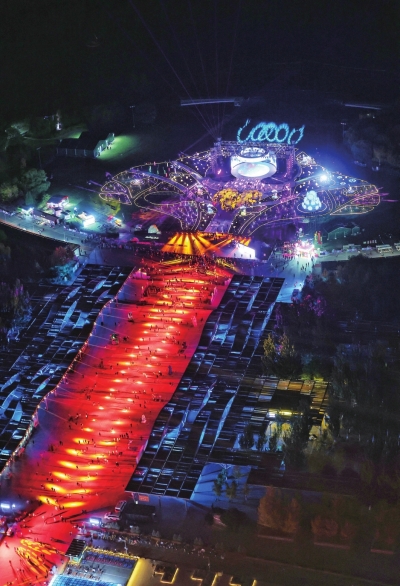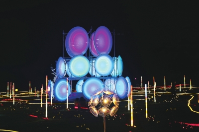 从奥林匹克塔上向下俯视,一幅璀璨的《生命之树》映入眼帘。“树”的整体由绚烂多姿的灯光艺术作品编织而成,“树冠”部分是此次灯光节开幕式的主会场——奥森南园草坪区,布满星光点点,装置着各国灯光作品;“树干”连接着中轴线主会场与景观大道,以灯光线勾勒,为游客搭建了一个梦幻壮观的灯光交互舞台。作品不时变幻着绿、红、黄、白四色,彰显“四季”交替,以及生命的多样性与无限可能。