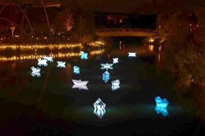 于河畔近观,可见冯嘉城在创作中对作品意境的着力塑造。亚克力板裁出的一只只“纸船”漂在水面上,纸船元素和缓缓水流动静交融,呈现出悠远深邃的自然之美。“为做好内部防水,我们在纸船里设计了巧妙的结构,让纸船可以自动调整内部气压,实现不同天气情况下的漂浮,展现灯光艺术装置柔美的律动。”冯嘉城介绍说。