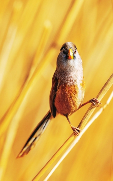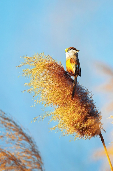 震旦鸦雀体型娇小,体长约14-16厘米,喜欢梳着大背头,戴“白围脖”,身穿棕黄色的“衣服”,它活泼好动,常常用粉黄色的脚爪,牢牢地钩住芦苇秆,就像手拿红缨枪的小战士站在枝头张望。快来北京朝阳,与这位小巧玲珑、萌力全开的小精灵来一场美丽的邂逅吧。