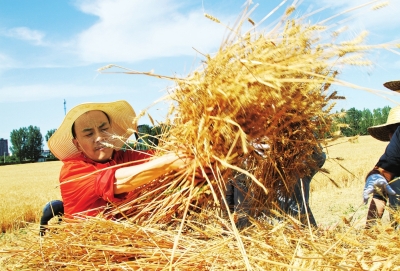 起初,大家动作略显生疏、小心翼翼,随着不断尝试,渐渐掌握了割麦要领。镰刀划开麦秆的“沙沙”声此起彼伏,沉甸甸的麦秆被一把把割下。不少人额头沁出汗珠,后背也被汗水浸透。居民王女士擦着额头的汗水感慨:“平时总说‘粒粒皆辛苦’,但感受不深,这次亲手割麦,才真切体会到丰收背后的艰辛,每一粒粮食都来之不易。”收割后的麦穗被运往脱粒区,伴随着机器的轰鸣,或是传统工具的上下挥动,饱满的麦粒簌簌落下。居民们双手捧起新脱的谷粒,感受着“颗粒归仓”的喜悦。