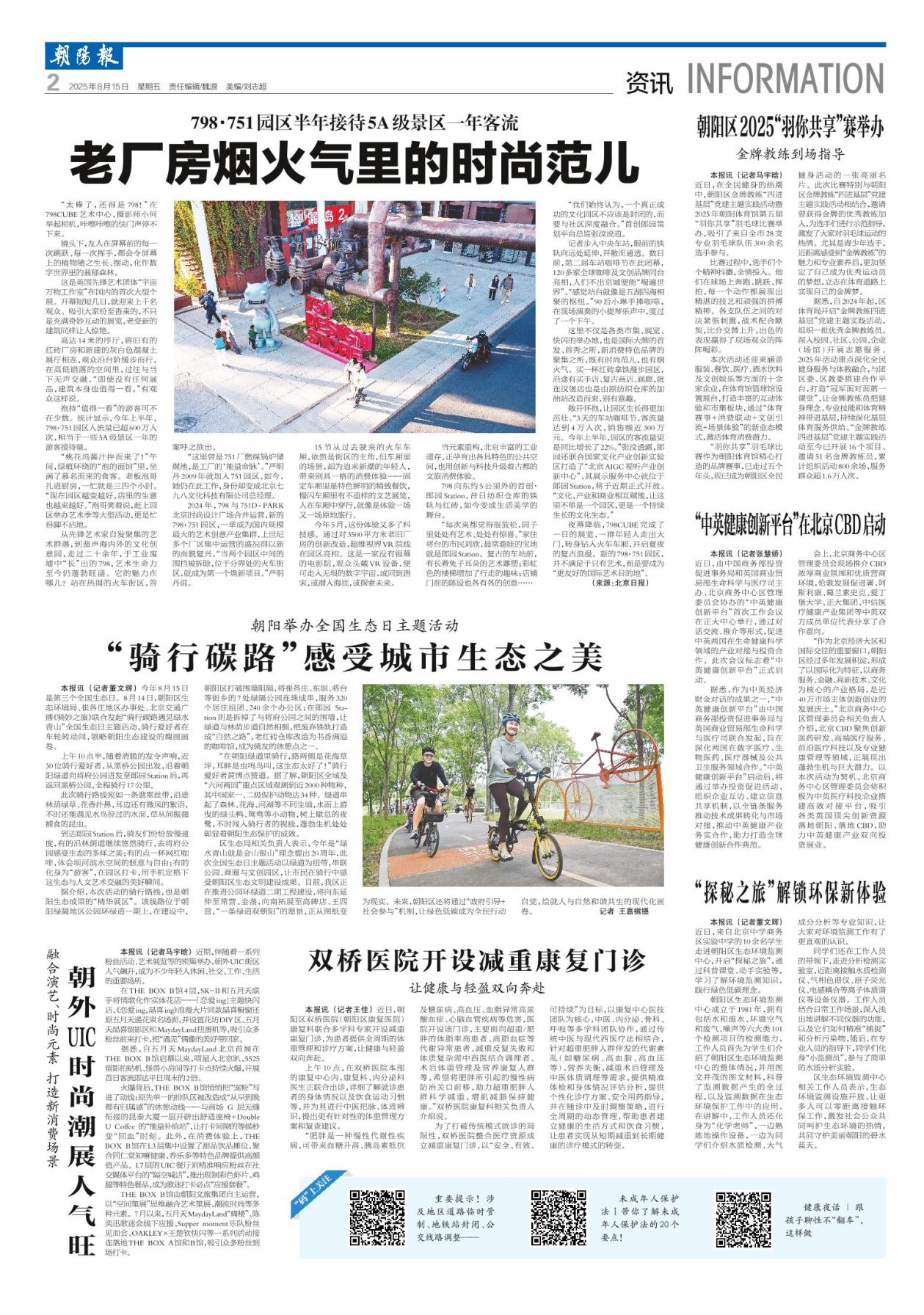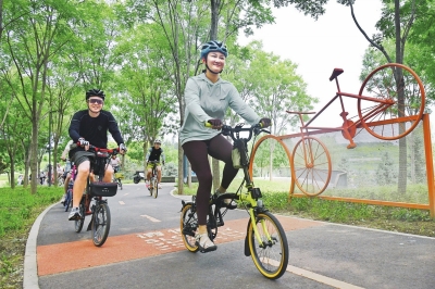 区生态局相关负责人表示,今年是“绿水青山就是金山银山”理念提出20周年,此次全国生态日主题活动以绿道为纽带,串联公园、商圈与文创园区,让市民在骑行中感受朝阳区生态文明建设成果。目前,我区正在推进公园环绿道二期工程建设,将向东延伸至常营、金盏,向南拓展至高碑店、王四营,“一条绿道观朝阳”的愿景,正从图纸变为现实。未来,朝阳区还将通过“政府引导+社会参与”机制,让绿色低碳成为全民行动自觉,绘就人与自然和谐共生的现代化画卷。 记者 王嘉樾摄