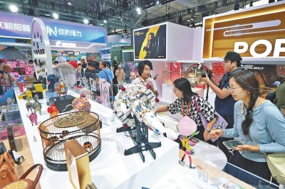 在泡泡玛特展台前,十余个大小不同的Molly站在玻璃展柜中。作为中国领先的潮玩文创,非遗系列是泡泡玛特在本届服贸会的主推产品。“我们将多种非遗制作技艺与潮玩设计相结合,比如Molly玩偶小裙子上点缀的精美南京绒花,还有采用了粉彩轧道瓷工艺制作的陶瓷体Molly玩偶,这些款式深受年轻人喜爱。”泡泡玛特相关负责人表示,“希望通过服贸会这个平台,让更多人看到中国潮玩IP的深度延展能力与传统文化的精美技艺,让更多全球消费者爱上中国潮玩。”